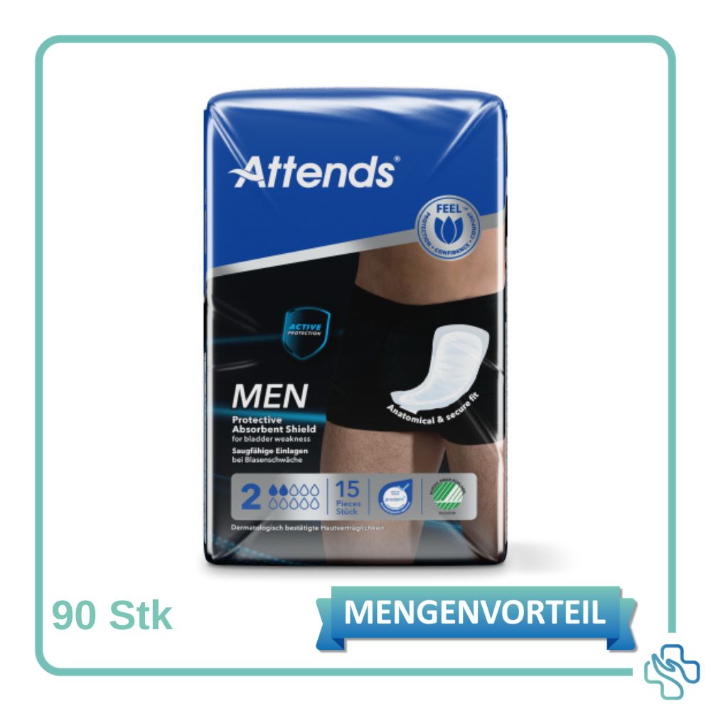 Attends Men 2 Protective Absorbent Shields sind saugfähige, besonders schmal geschnittene Einlagen für Männer bei leichter bis mittlerer Blasenschwäche. Sie wurden speziell für die männliche Anatomie entwickelt und sind bequem und unauffällig zu Tragen. Sie haben einen schmalere Form als Attends For Men 3.