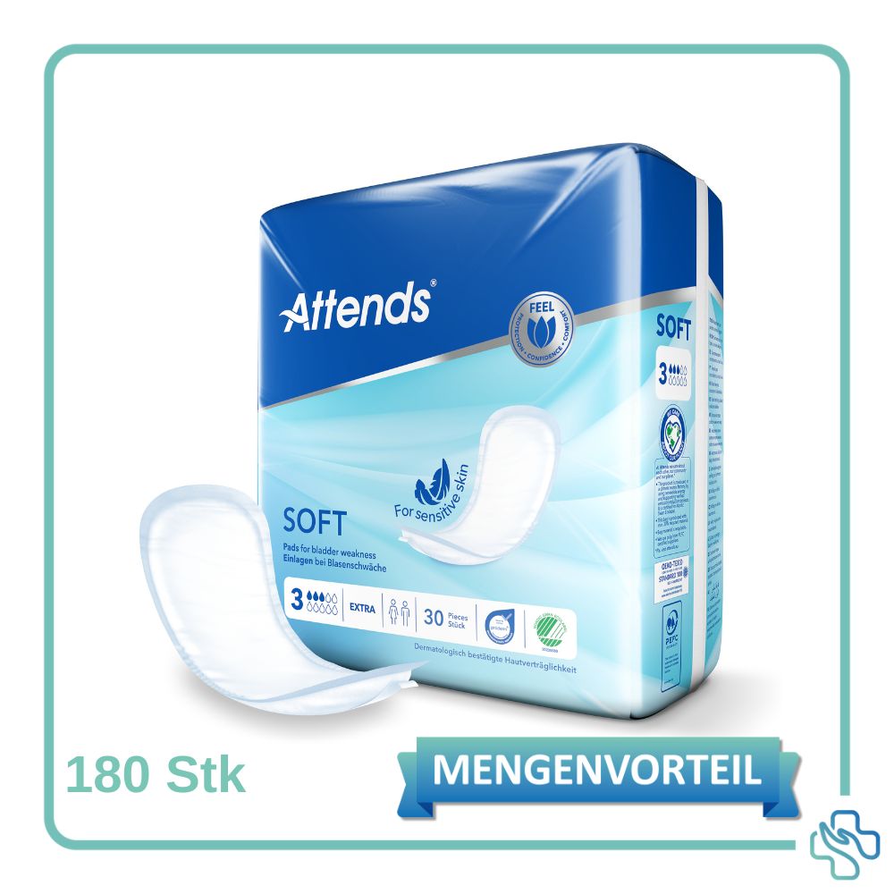 Attends Soft 3 sind  anatomisch geformte Hygiene-Einlagen mit einer  weichen Vliesoberfläche. Für leichte bis mittlere Blasenschwäche. Bei regelmäßigem Verlust von größeren Flüssigkeitsschüben und spürbarem Harndrang. Der sichere und trockene zweilagige leistungsstarke Saugkern mit hoch konzentriertem Superabsorber macht die Attends Soft Einlage besonders sicher. Attends Odour Protection verhindert die Entstehung von unangenehmen Gerüchen. Die Einlage für Damen oder Herren ist hautfreundlich und atmungsaktiv. Weiche Seitenbündchen bieten einen zusätzlichen Auslaufschutz. Attends soft extra mit 6 mm Stärke ist sehr diskret und anatomisch geformt für einen hohen Tragekomfort. Praktisch und dezent: einfach mit Klebestreifen in der Unterwäsche zu befestigen. Latexfrei. Die Einlage ist ideal zum Mitnehmen da sie einzelverpackt ist.